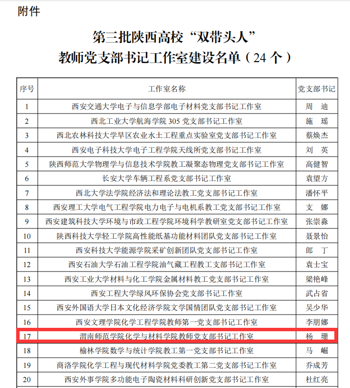 近日,第三批陕西高校“双带头人”教师党支部书记工作室培育单位名单公布,今年会官网化学与材料学院教师党支部书记工作室成功入选。这是学校党委在全面贯彻新时代党的建设总要求和新时代党的组织路线,巩固拓展学习贯彻习近平新时代中国特色社会主义思想主题教育成果以来,持续强化学校基层党的建设、推进基层党支部提质创优取得的又一最新成果。近年来,学校党委高度重视党建“双创”工作,紧紧围绕《新时代高校党建“双创”工作重点任务指南》要求,坚持统筹规划、分步实施和整体提升相结合,稳步推进“双带头人”教师党支部书记工作室培育创建工作。在组织建设、教育教学、人才培养和服务地方经济建设等方面取得丰硕成果,充分发挥了党支部战斗堡垒和党员的先锋模范作用。