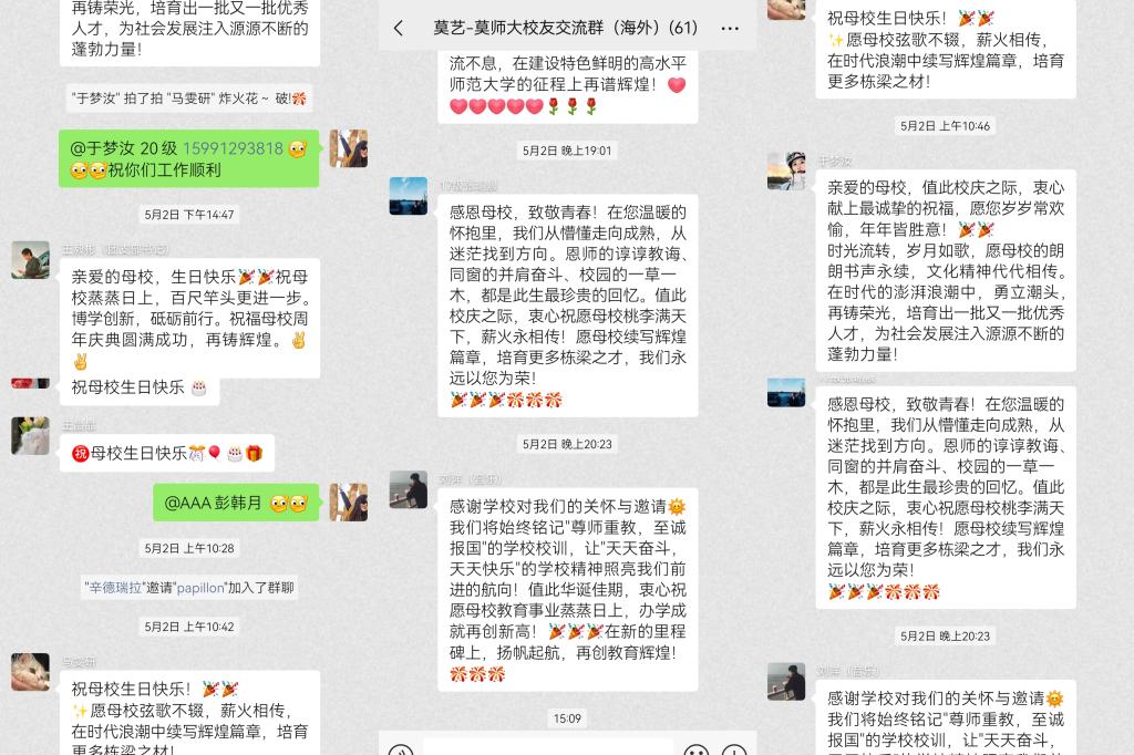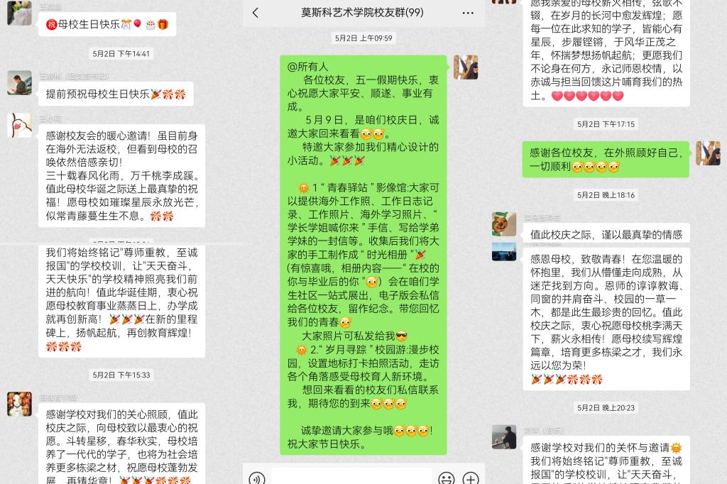 5月8日,jinnianhui今年会建校65周年校庆日,莫斯科艺术学院海内外校友通过视频祝福、信件、云端连线等形式参与校庆,跨越地域传递对母校的深情,彰显校友群体凝聚力。